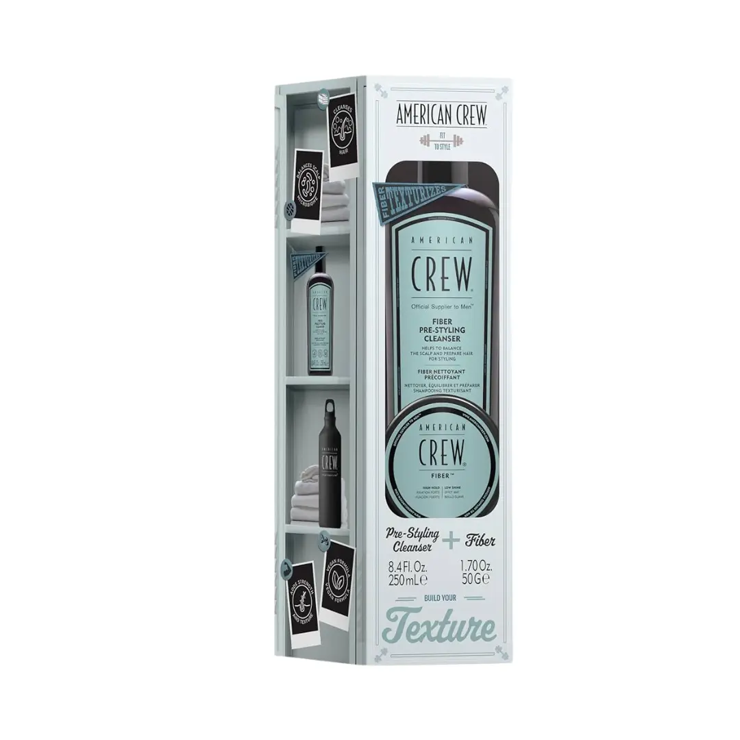 AMERICAN CREW Fiber Duo Gift Set is a gift set for men containing Fiber Pre-Styling Cleanser shampoo and Fiber Classic styling paste for a textured hairstyle with a strong fixation.