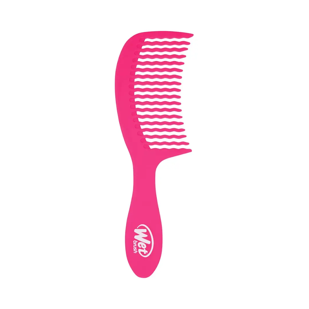 Wet Brush Detangling Comb Pink ist ein Kamm mit breiten Zähnen, der das Haar leicht gleitet und sich ideal zum Auftragen von Conditioner oder Maske eignet.