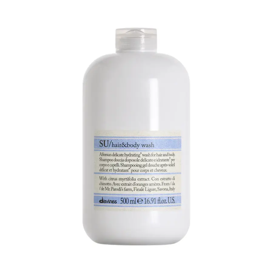 Davines SU Hair & Body Shampoo es un gel limpiador suave tanto para el cabello como para el cuerpo, diseñado para usar después de tomar el sol o al aire libre.