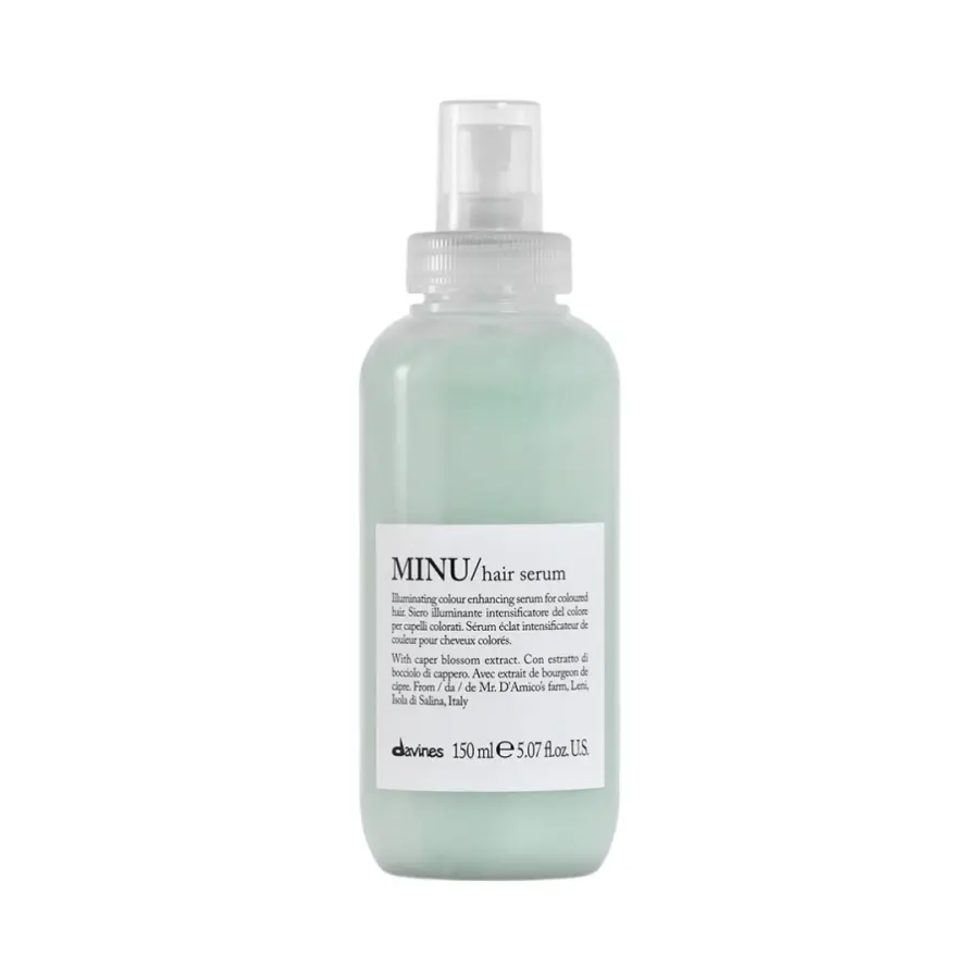 DAVINES MINU HAIR Serum es un suero sin enjuague diseñado para proteger y realzar el brillo del cabello teñido.