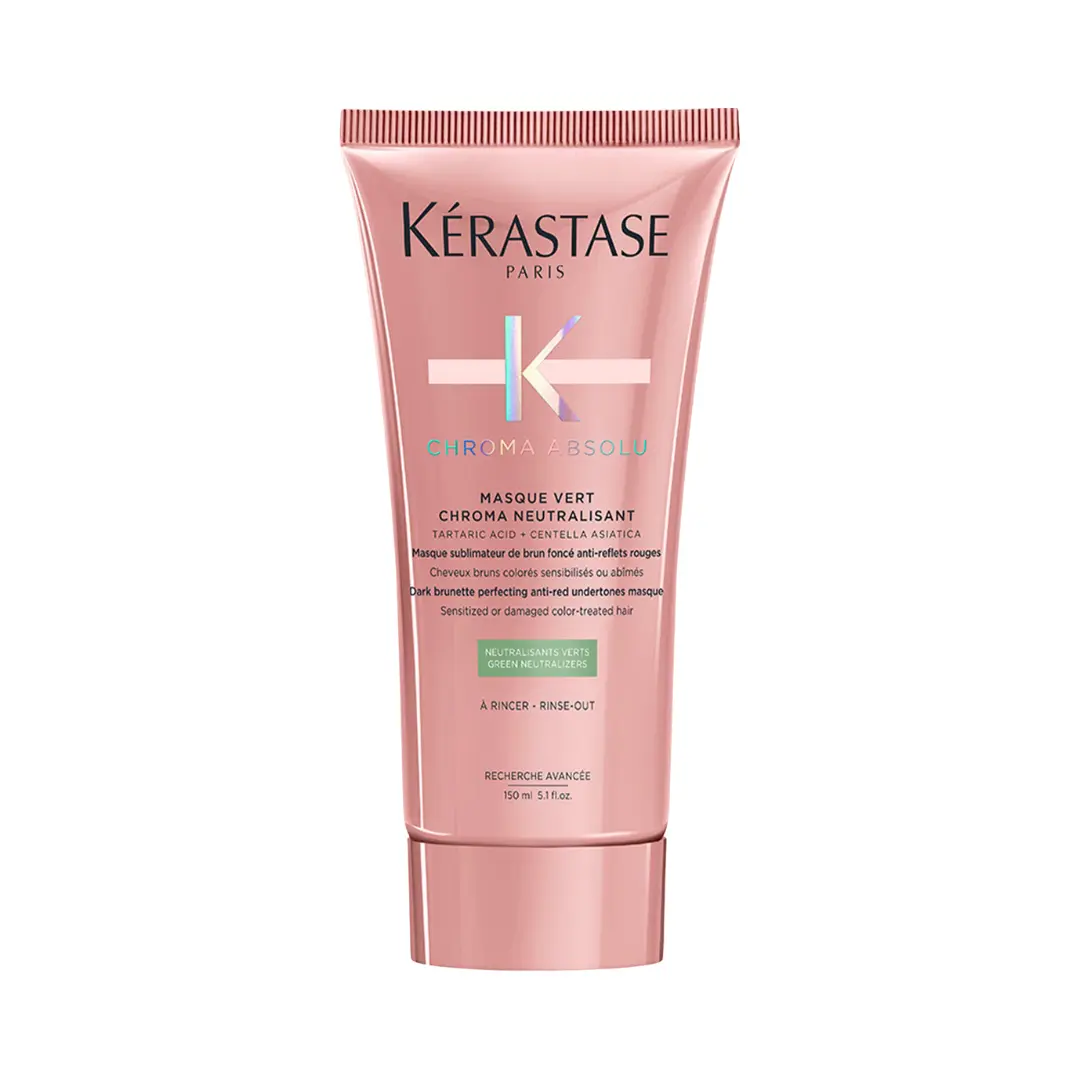 Kérastase Chroma Absolu Masque Vert Chroma Neutralisant je unikátní maska ​​na vlasy se zelenými a modrými barevnými pigmenty. Neutralizuje nežádoucí měděné a červené podtóny u tmavých, brunetových a barvených vlasů. Kérastase Masque Vert Chroma Neutralisant bojuje s červenými a měděnými podtóny, působí proti nežádoucím červeným a měděným podtónům u tmavých, brunetových a barvených vlasů. Vysoce účinné složení obsahuje kyselinu vinnou a Centella Asiatica, které vyživují a dodávají zdravý, zářivý lesk. Vlasové vlákno je hydratované a pružné. Maska snižuje krepatění způsobené barevnými úpravami a zlepšuje ovladatelnost. Vlasy jsou bez červených podtónů a mají zdravý a lesklý vzhled. Používejte rukavice, abyste si chránili ruce před znečištěním.