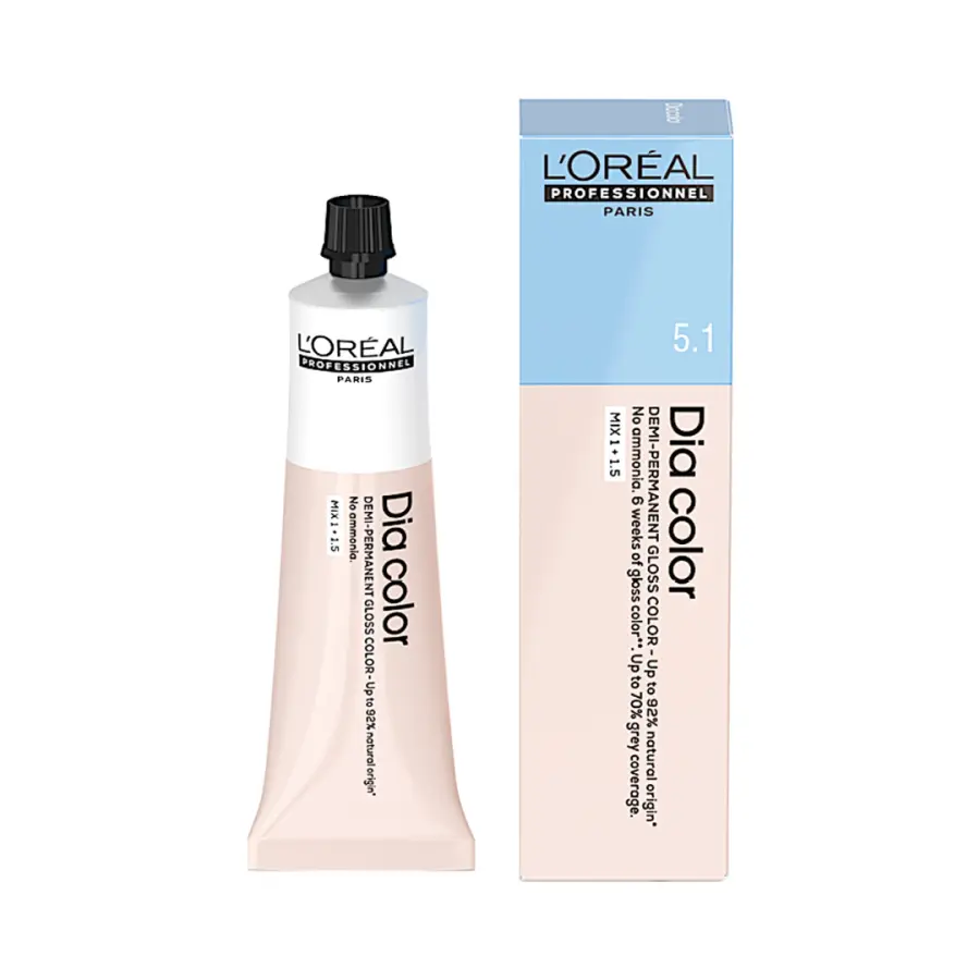 La coloration semi-permanente L'ORÉAL PROFESSIONNEL Dia Color 5.1 offre un ton cendré naturel pour un ravivage subtil de la couleur.