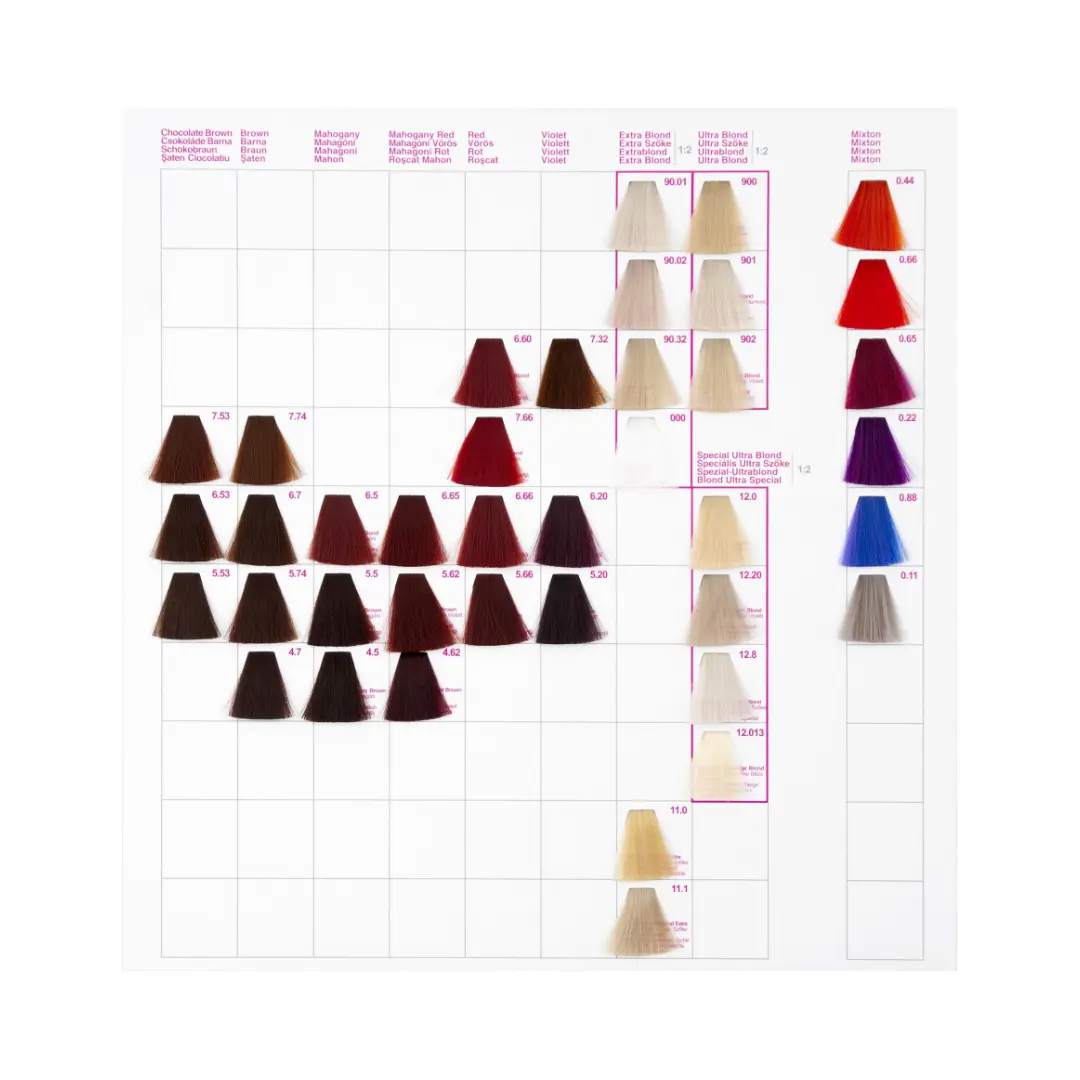 Vzorník permanentních barev Hair Color Cream 100ml obsahujících keratin a arganový olej vám poskytne přehled o celé škále 92 odstínů.