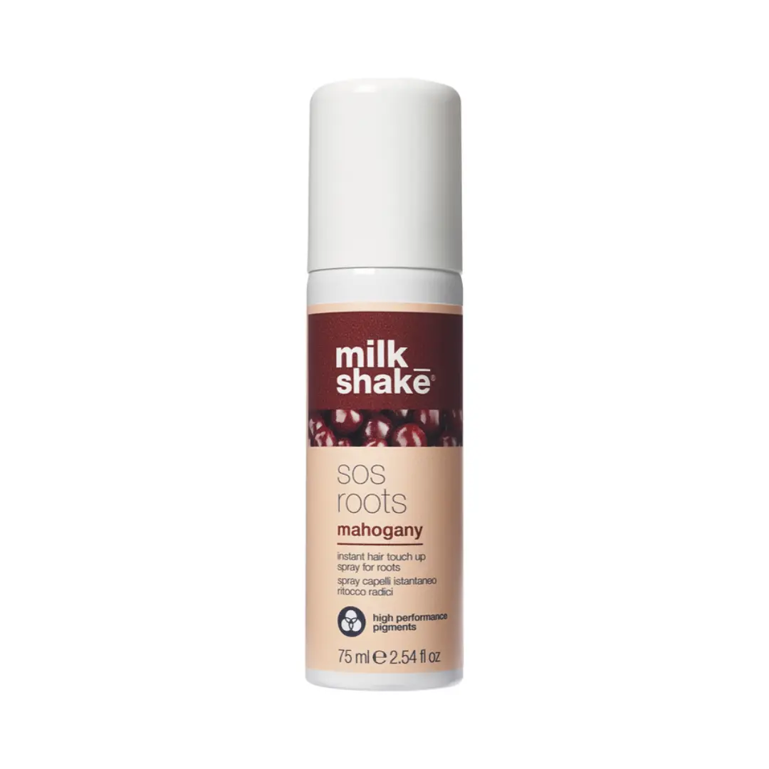 Milk_shake SOS Roots Mahogany est un spray pour couvrir les excroissances dans une teinte acajou, ce qui donne aux cheveux un ton brun rougeâtre chaud.